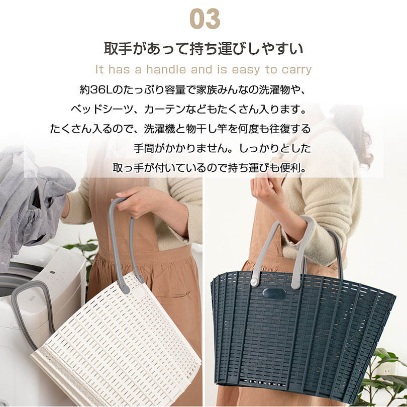 ・広げると幅約50cmの大容量バスケット。開口部が広くて、衣類とタオルなどだけでなく、毛布と寝具のような大判のものも入れやすい。約36Lの大容量サイズで、家族みんなの洗濯物がしっかり入りきります。