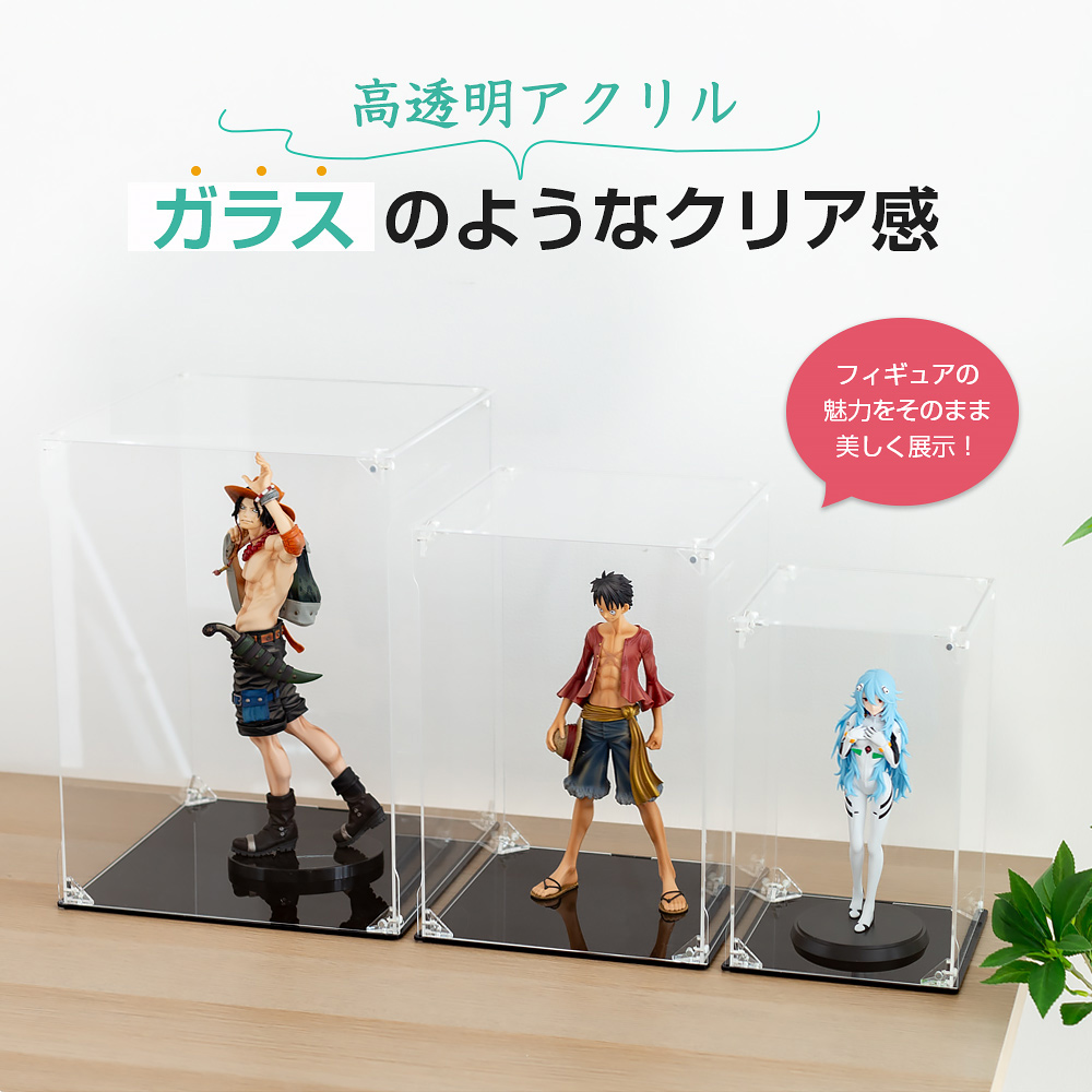 高透明アクリル素材を採用したフィギュアケース。ガラスのようなクリアな視界で、フィギュアや模型、コレクションを美しくディスプレイできます。全面透明デザインのアクリルケースなので、360度どの角度からでも鑑賞でき、インテリアとしても映えるコレクションケースです。