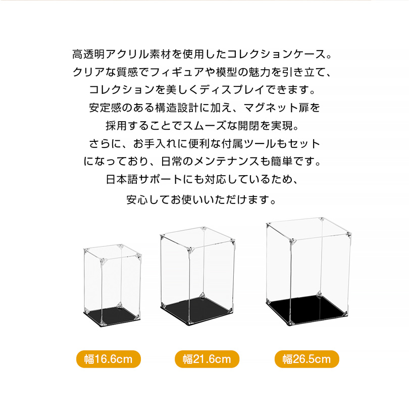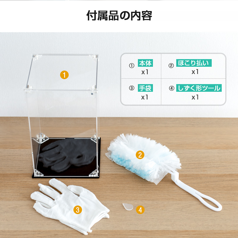 指紋防止手袋と簡易ほこり払いを付属し、フィギュアケースのお手入れにも便利です。さらに日本語サポートにも対応しており、万が一の際も安心してご利用いただけます。