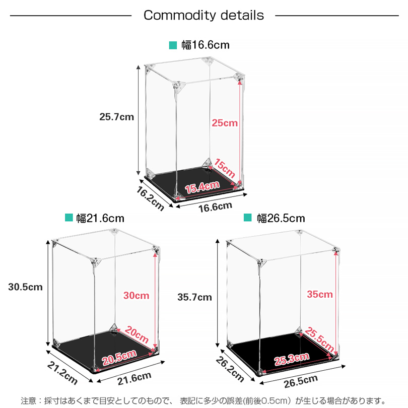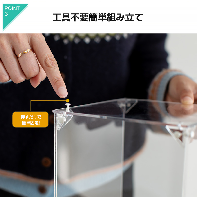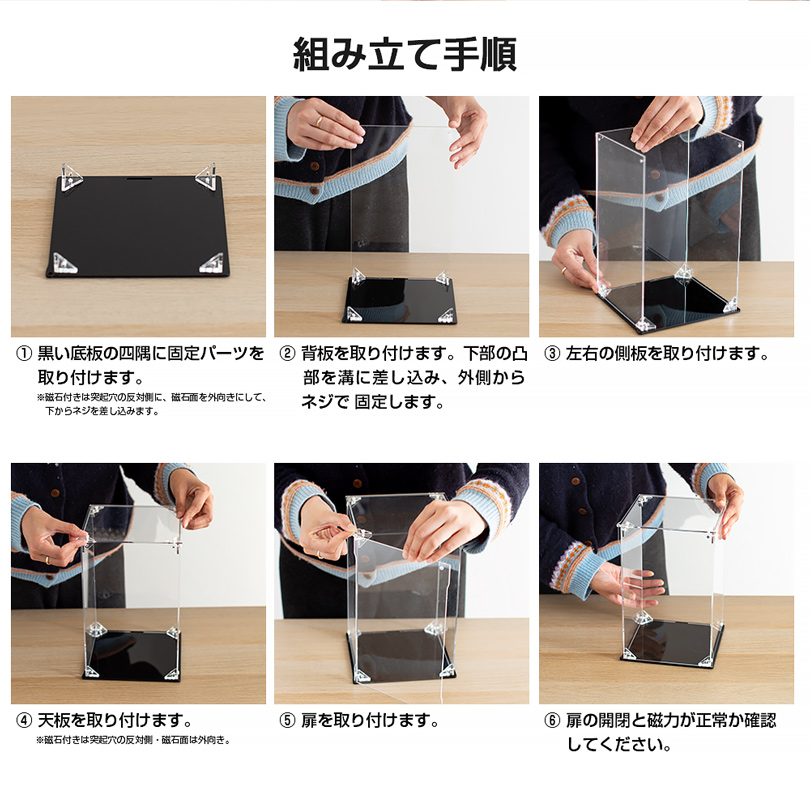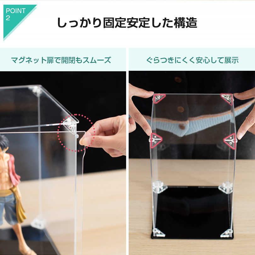 各パーツをしっかり固定できる設計で、ケース全体の安定感を高めています。ぐらつきにくく、大切なフィギュアや模型、コレクションを安心して展示できるアクリルディスプレイケースです。